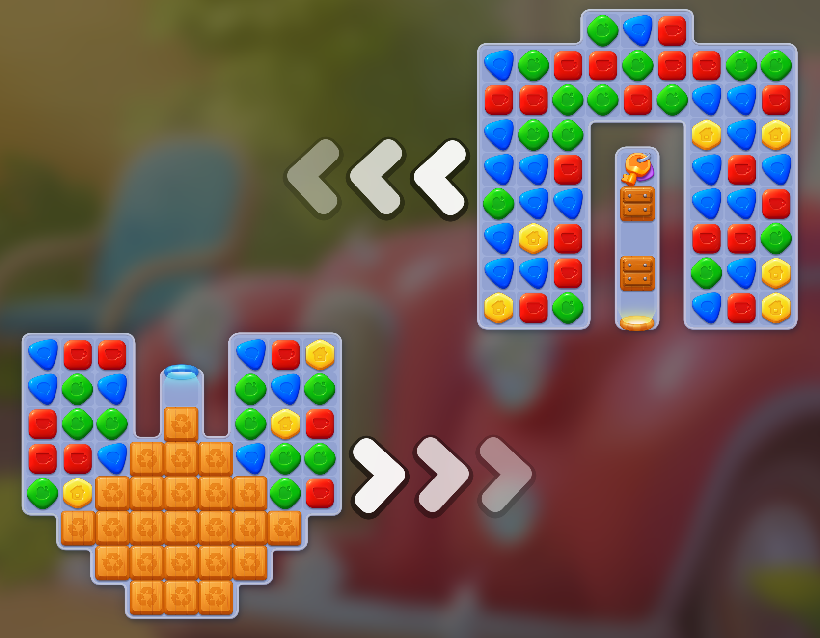 Der Scroll wird in langen Levels verwendet und zeigt jeweils nur einen Teil des Spielfelds. Sie können Kombinationen bilden oder Booster einsetzen, um Ziele nur im sichtbaren Bereich zu erreichen. Elemente außerhalb davon bleiben inaktiv, bis die Kamera zu ihnen scrollt. Sobald Sie das erste Feld abgeschlossen haben, bewegt sich die Kamera zum nächsten, bis Sie das Levelziel erreichen.
