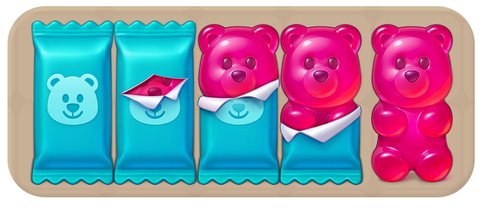 Austin picked up some gummy bears from the shop. Make 4 matches next to the wrapper to tear it open. Then help the gummy bear reach the bottom of the board.